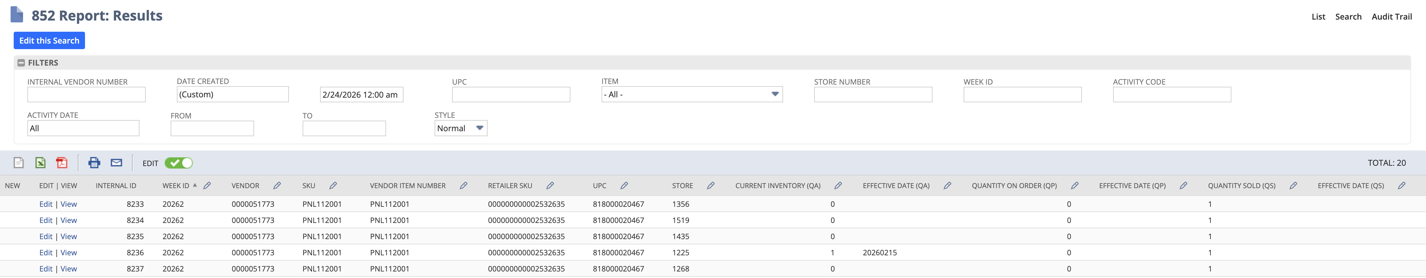Below is an example of how Ulta EDI 852 product activity data appears once it is integrated into NetSuite using Celigo.